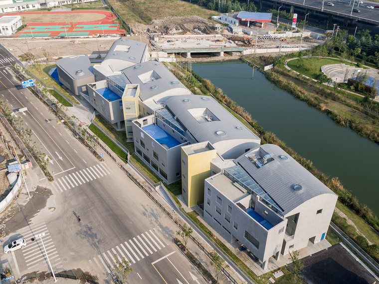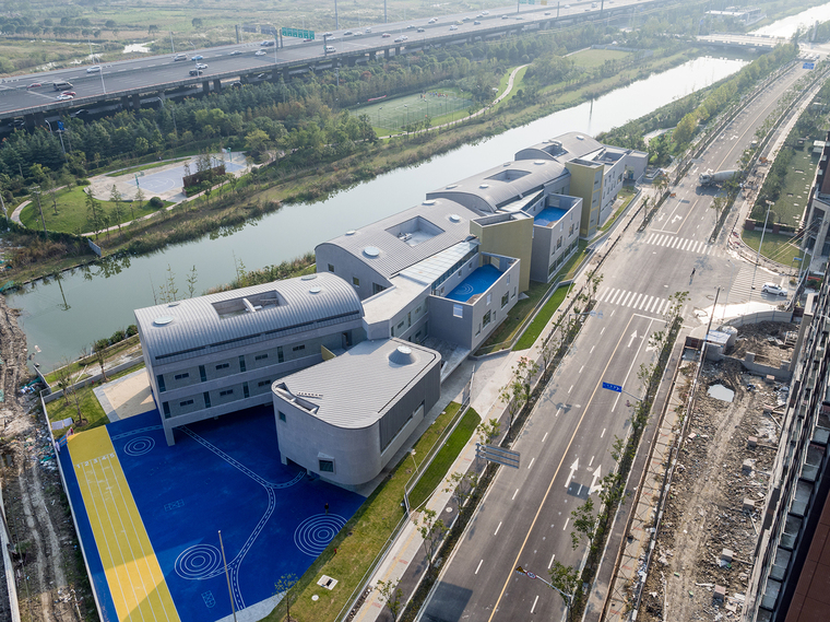 幼兒園是孩子們在成長過程中第一個接觸的公共空間。空間的尺度、使用的靈活度以及室內的場景和氛圍,對于幼兒的感受和認知都有很大影響,對于建筑師也是一個挑戰。設計要能激發孩子們探索和學習的興趣,同時要給他們足夠的安全感,要有家的感覺。在調研期間,設計團隊也發現,非正式空間-如活動室前的走廊-往往是孩子們生活、交往、嬉戲的重要場所。功能、空間與環境的關系,是本案在設計初始所面臨的主要矛盾和核心議題。張江萬科實驗幼兒園位于一個狹長的三角形地塊。基地南側為中環路高架與河道綠化,北側為高層住宅區,東側為一座跨河道的車行橋,西側則為一棟需要容納在場地內的區域環網站。要做出一個回應場地限制條件并符合教育局規范標準的15個班全日制幼兒園,這塊特殊的基地便顯得極具挑戰性。建筑師需要在滿足規劃指標、使用面積、規范性、安全性等硬性要求的前提下,在一個相對局促的場地里,創造出符合老師教學管理、誘發兒童探索心理、和滿足家長預期的幼兒園。