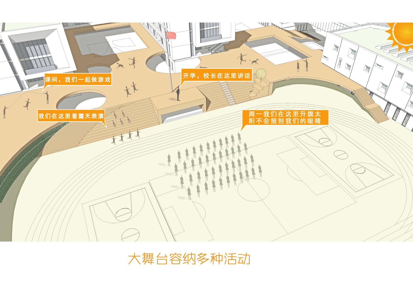 “雙首層”概念是將學(xué)校地上中心部分,局部進(jìn)行一層架空懷抱住操場,架空平臺按照一半面積計算為1100平方,平臺上設(shè)置多個采光井,與景觀設(shè)計融為一體,形成學(xué)生的二層活動空間,與教師增加更多學(xué)習(xí)交流的互動空間,平臺下設(shè)置了功能房間,一個400平圖書閱覽室,2個音樂教室,1個舞蹈教室,一個體育器材室以及公廁。也形成了學(xué)生的一層活動空間,這樣解決了學(xué)生多活動場地少的難題,也解決了舞蹈音樂教室對普通教室教學(xué)引起的噪音污染問題。